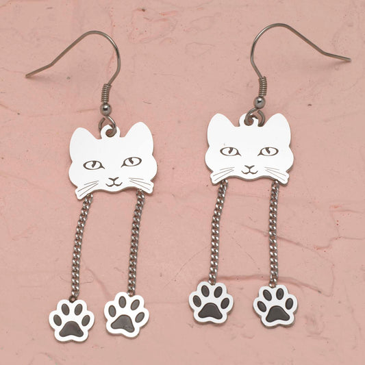 Adorable Cat Face Dangle Earrings with Paw Charms St...