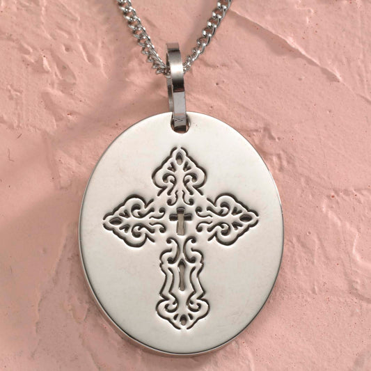 Etched Serenity Prayer Cross Pendant Necklace Stainl...