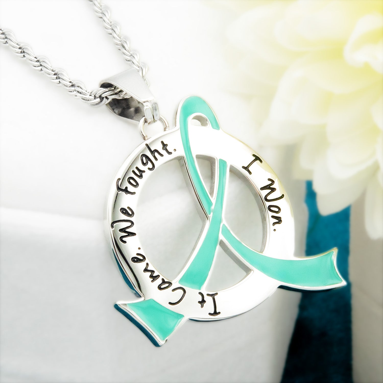 Show your support and spread hope with one of our Cancer Survivor Pendant Necklaces. Thoughtfully crafted in polished stainless steel, each piece features awareness ribbons in the coordinating color and the phrase screened on the round circle "It Came We Fought I Won" surround the ribbon, symbolizing strength, resilience, and triumph.
