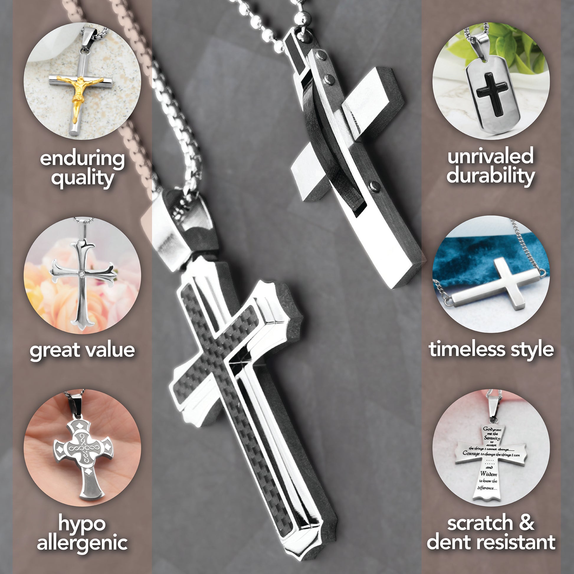 Men's Stainless Steel Cross Pendant Necklace with Carbon Fiber Inlay - Religious Christian Cross Jewelry Gift for Him