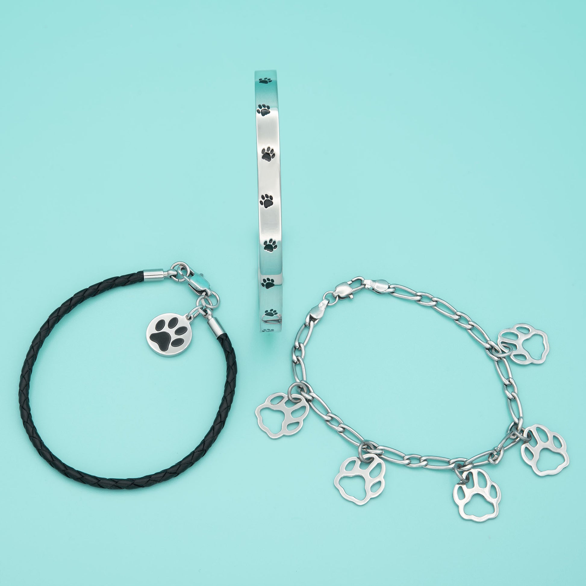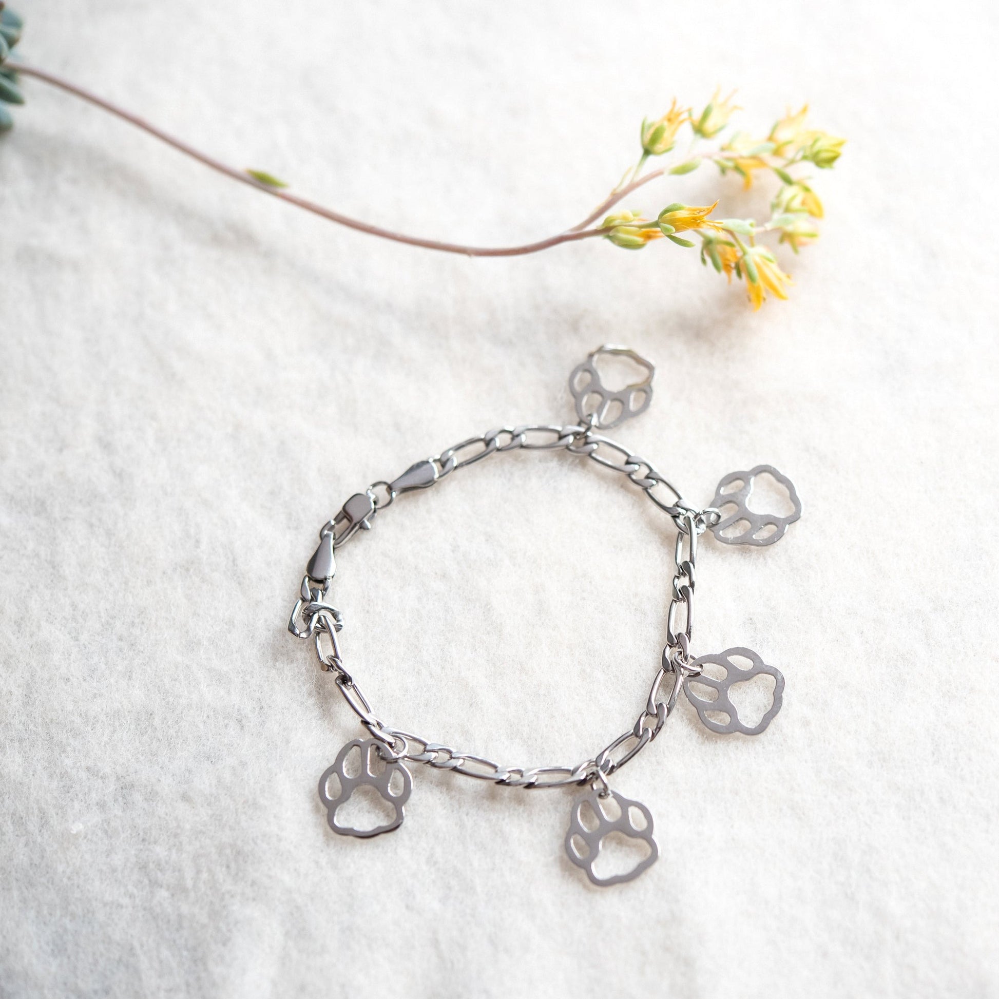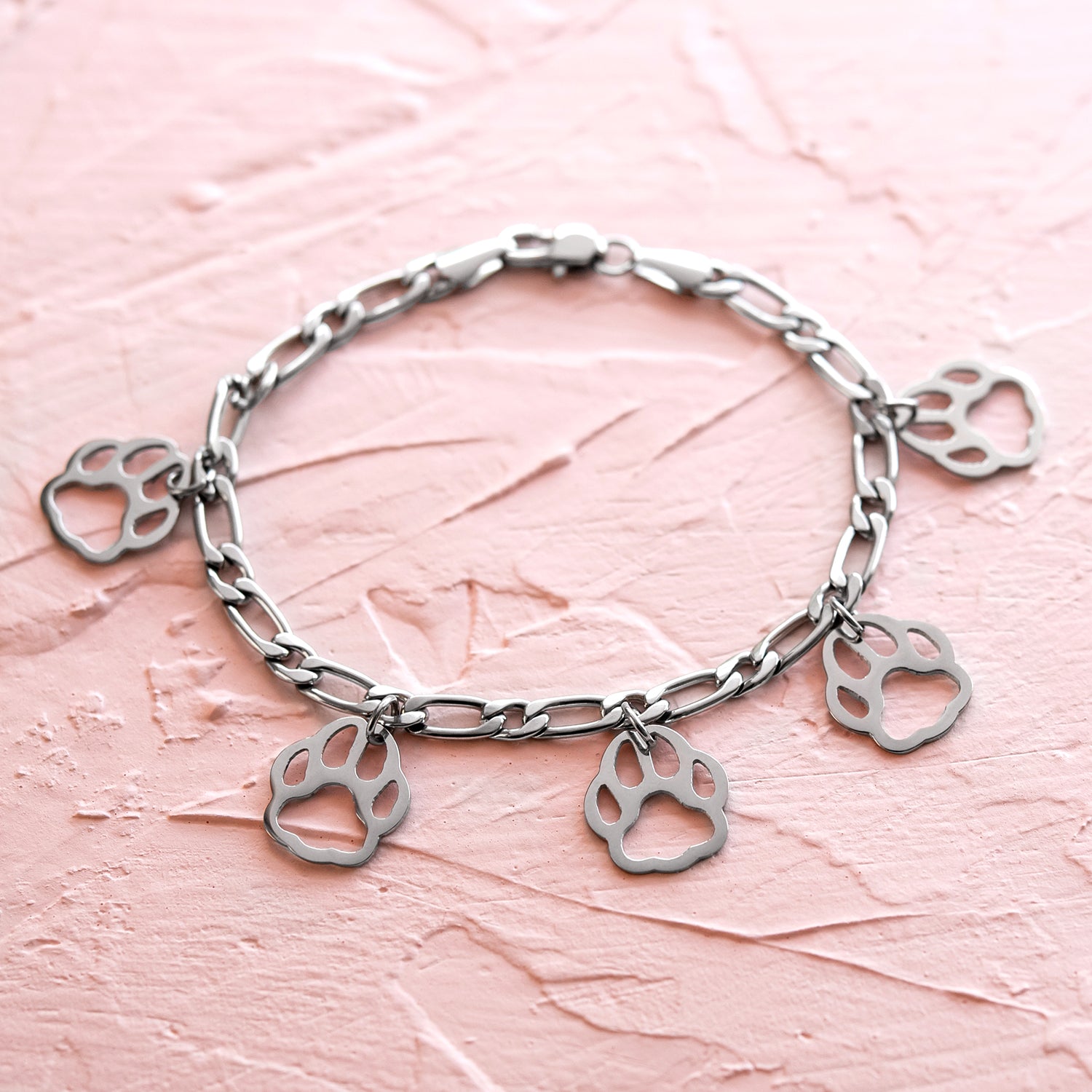 Show your love for your furry friend in style with this fashionable and fun Steel paw print charm bracelet. The perfect accessory for any pet owner, this bracelet features adorable paw print charms that symbolize the special bond between you and your beloved cat or dog. Wear it on its own for a simple statement or layer it with other bracelets to create a personalized look that's all your own. This versatile piece makes a thoughtful gift for animal lovers and a stylish addition to any jewelry collection.