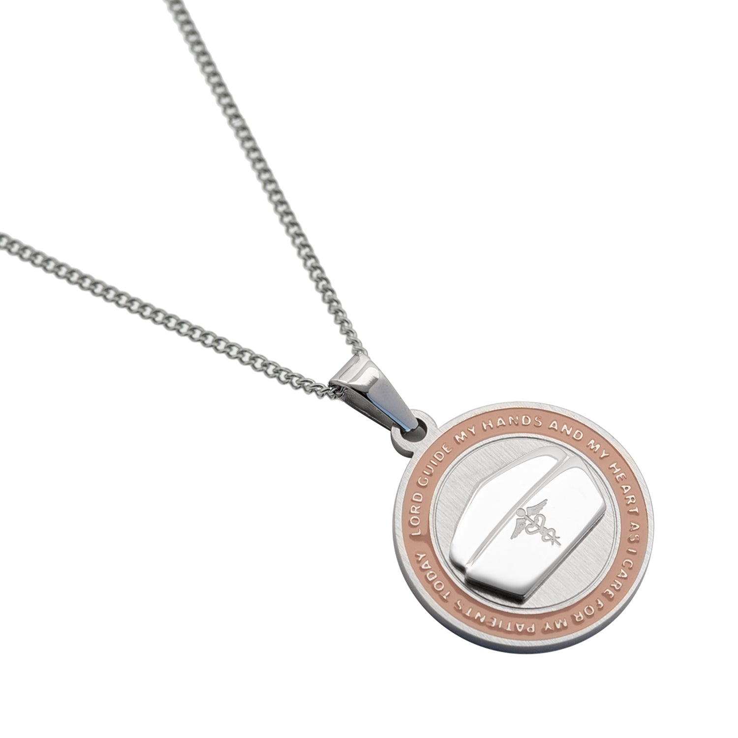 Show your appreciation for the dedicated nurses in your life with this beautiful and meaningful Round Nurse's Prayer Pendant Necklace. Crafted from durable brushed stainless steel, this 1-inch round pendant features a polished nurse's cap set against a vibrant blue enamel background. Engraved along the outer edge is the heartfelt nurse's prayer: "Lord, guide my hands and my heart as I care for my patients today". The pendant hangs from an 18-inch stainless steel chain with a 3-inch extender for adjustable length.