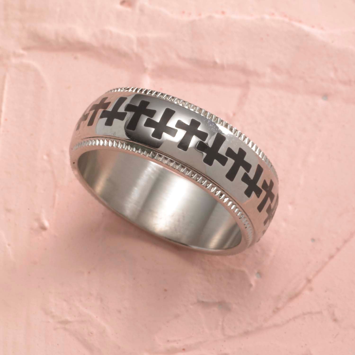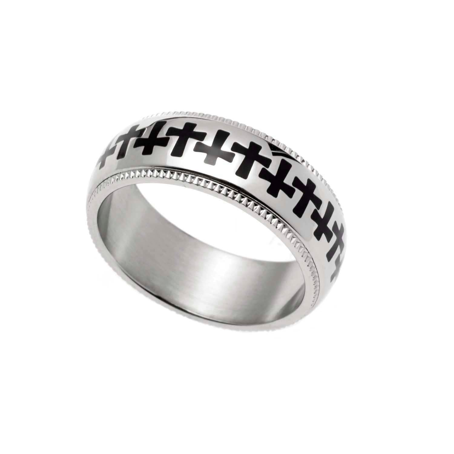 Express your faith in style with the Stainless Steel Milgrain Edge Interlocking Cross Ring. This unique ring features a bold design of interlocking crosses etched into the band, surrounded by an intricately textured milgrain edge. Crafted from polished stainless steel, this durable and tarnish-resistant ring is a powerful reminder of your devotion that you can wear every day. Available in sizes 5 through 10, this unisex ring makes a meaningful gift for religious occasions like baptisms, confirmations, or holidays. Whether you're treating yourself or giving a heartfelt gift, the Milgrain Edge Cross Ring is a beautiful symbol of faith you'll treasure.